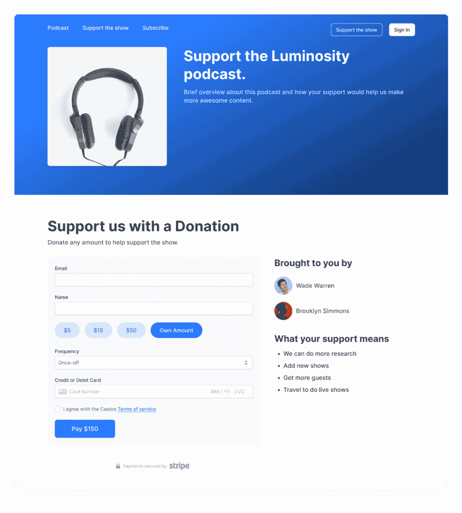 Castos advantage: Castos Commerce builds donation functionality directly into your hosting platform. Accept one-time and recurring support without third-party fees, creating a seamless experience for your listeners while you keep more revenue.
