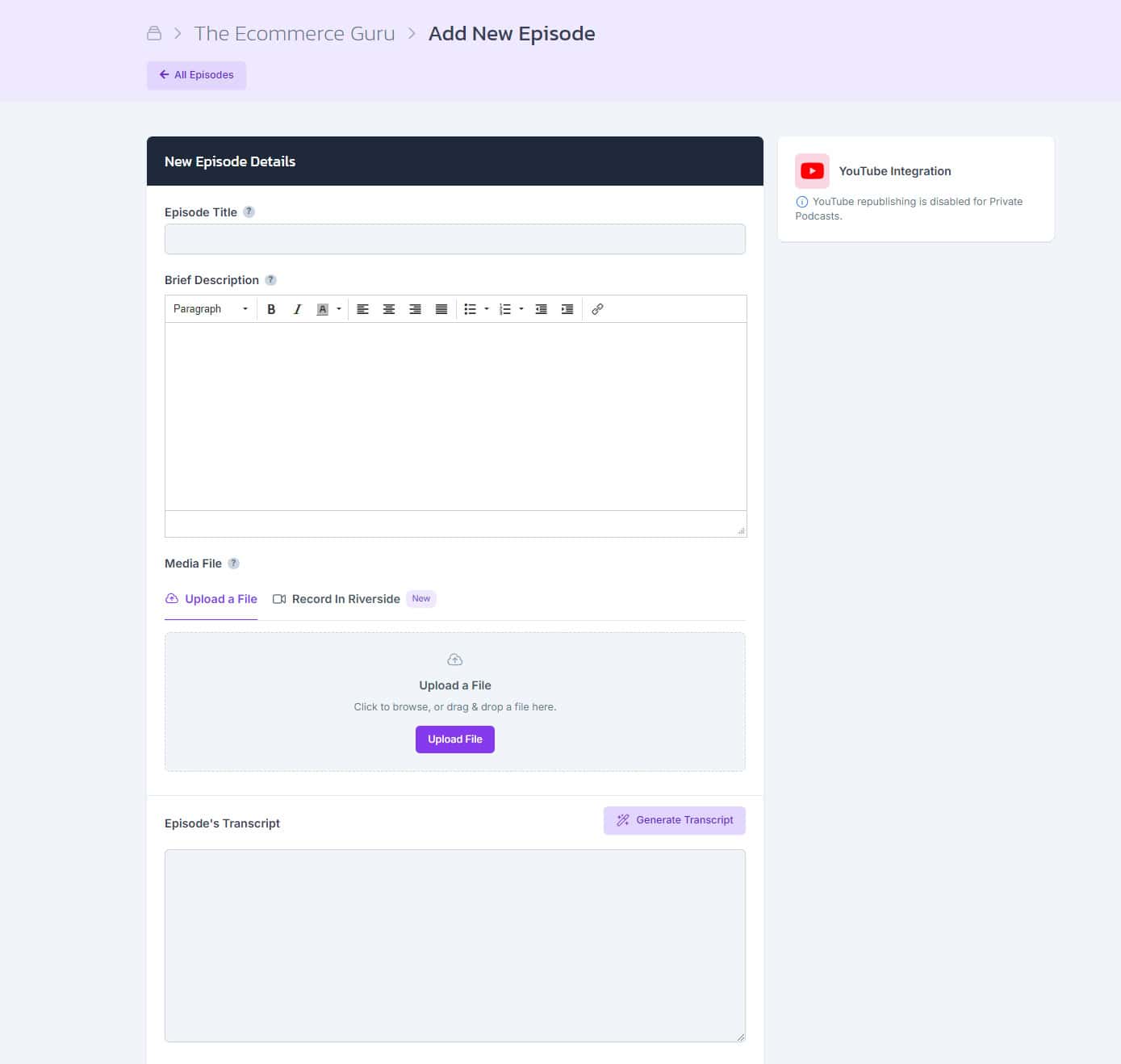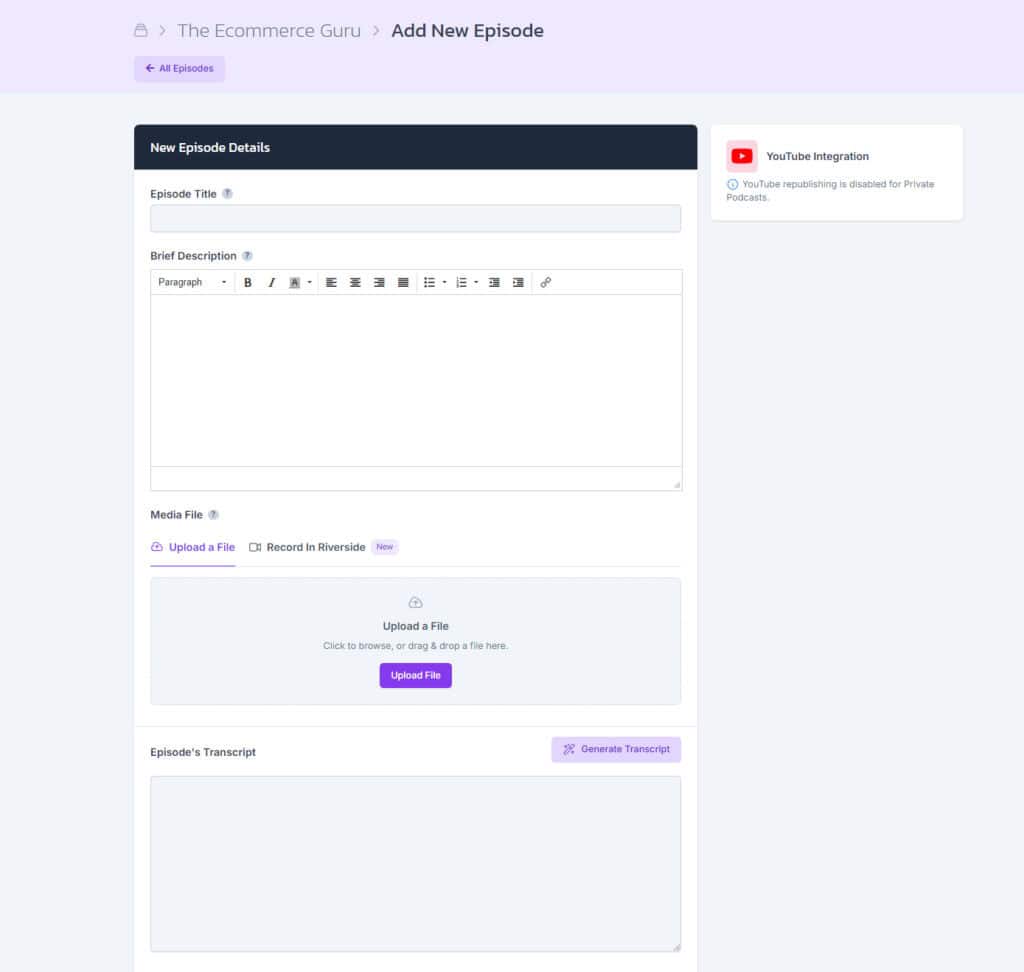 Step 1: Upload a new episode and complete the required fields